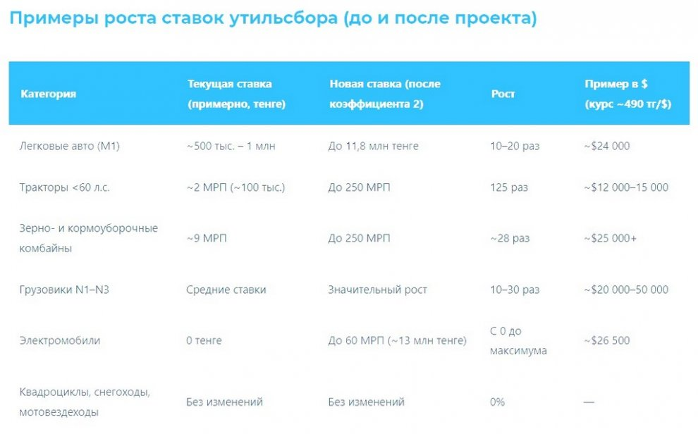Новый казахский расчёт предполагает применение специального повышающего коэффициента к автомобилям и самоходной сельскохозяйственной технике из РФ и Беларуси. Для других стран-членов ЕАЭС (Армении, Киргизии), а также для третьих государств, ставки останутся прежними. Конкретные цифры выглядят ошеломляюще: для массовых легковых автомобилей с двигателем объёмом 1-2 литра сбор может вырасти с текущих, примерно, 114 тысяч рублей до 4,4 миллионов. Для более крупных двигателей повышение ещё значительнее. Так, для машин с мотором 2-3 литра ставка может подскочить, примерно, со 150 тысяч рублей до 4,8 миллионов рублей (или 32 млн тенге). Для техники с двигателем свыше 3 литров, включая сельхозмашины, сумма может достигать 7,2 миллиона рублей (48 млн тенге). Проект также затрагивает электромобили, для которых ранее ставка была нулевой, предлагая установить сбор в районе 300 тысяч рублей (2 млн тенге).